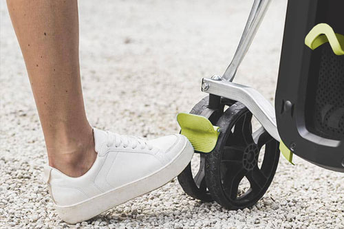 Nastavljive noge in močne zavore zagotavljajo stabilnost tudi na vrtovih z neenakomernimi podlagami. Velika kolesa omogočajo enostavno prestavljanje in postavitev.