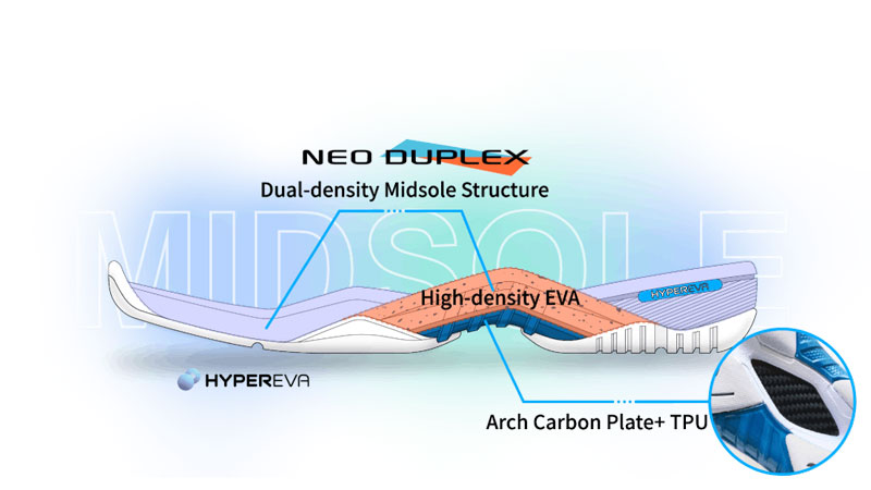 Copati iz serije S82 prvič uvajajo lahek in elastičen vmesni podplat HYPEREVA, ki uvaja strukturo dvojne gostote z visoko gostoto EVA na zunanji strani. Dodatek karbonske plošče na loku in TPU poskrbita za izboljšano podporo, hkrati pa tudi zagotavljajo nemoten prenos sile, kar učinkovito izboljša udobje na povsem novo raven.