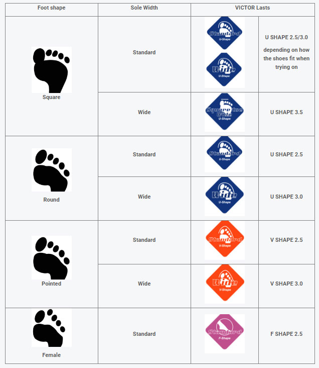 Večina igralcev badmintona se ob nakupu novih copat sprašuje, kako izbrati copate, ki se jim bodo maksimalno prilegali. Zato je VICTOR zasnoval sistem, ki temelji na različnih vrstah oblik stopalov, tako da vedno obstaja model, ki je odlična izbira za posamezno nogo. Preden pa vam predstavimo VICTOR-jev sistem, si poglejmo različne vrste oblik stopal, ki so razvrščene predvsem glede na obliko prstov in širino podplata.